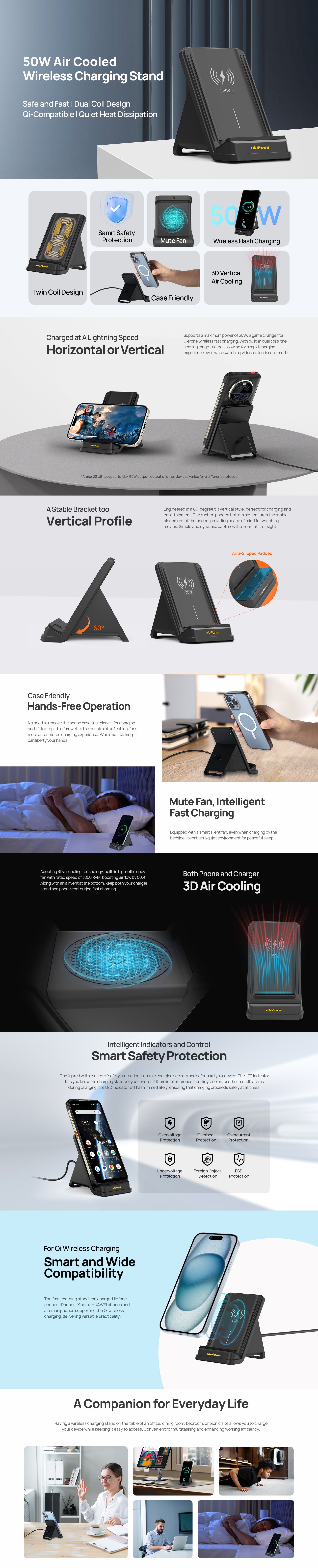 50W Air-Cooled Wireless Charging Stand: Efficient heat dissipation with dual-coil design.