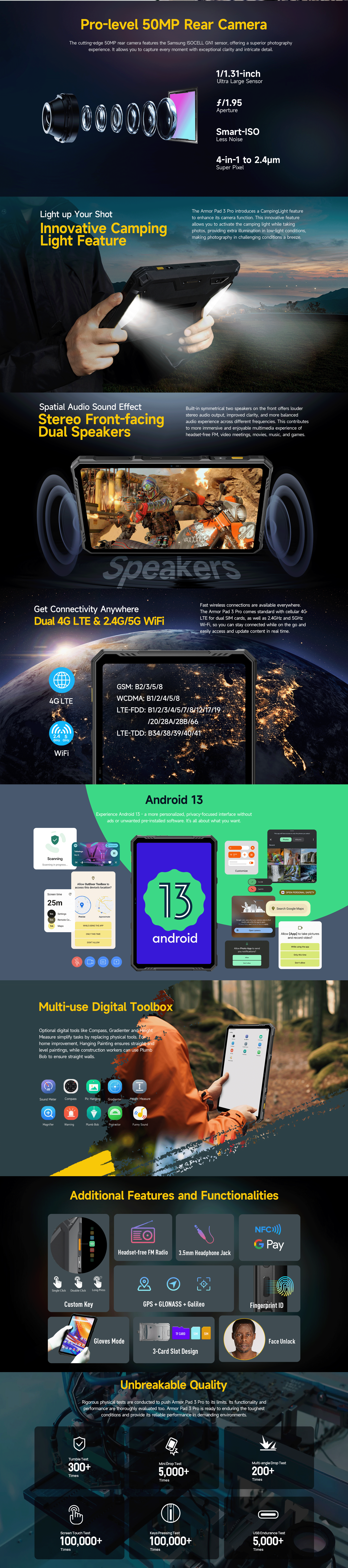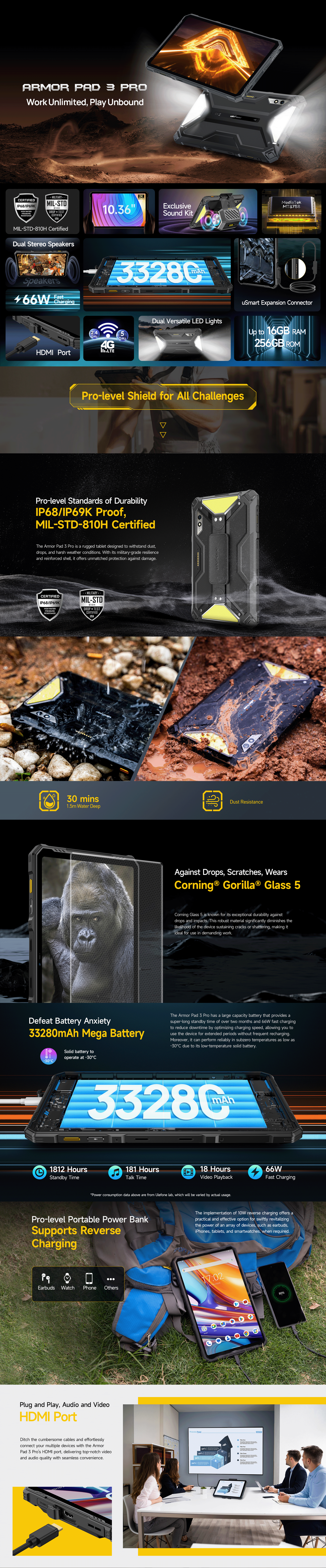 4. Armor Pad 3 Pro is splash, water, and dust resistant and was tested under controlled laboratory conditions with a rating of IP68 under IEC standard 60529 (maximum depth of 1.5 meters up to 30 minutes). Charger and accessories are not water-resistant. Splash, water and dust resistance are not permanent and might decrease as a result of normal wear. Do not attempt to charge a wet Armor Pad 3 Pro. Liquid damage not covered under warranty.