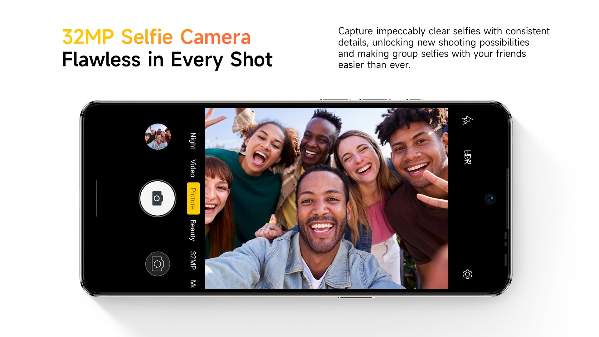 32MP Selfie Camera Capture impeccably clear selfies with consistent details, unlocking new shooting possibilities and making group selfies with your friends easier than ever.