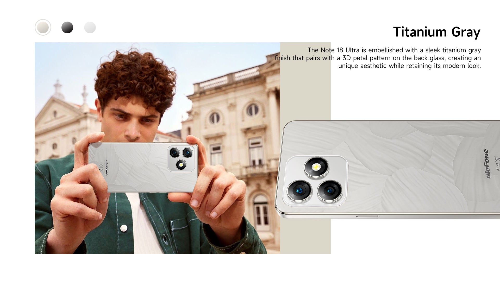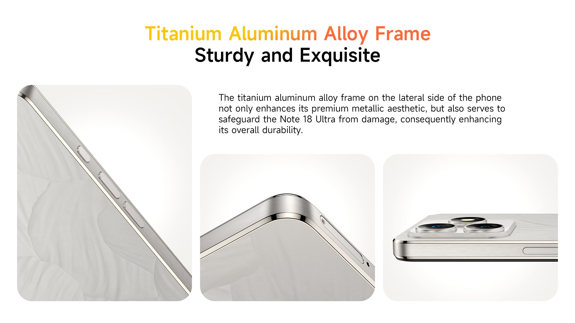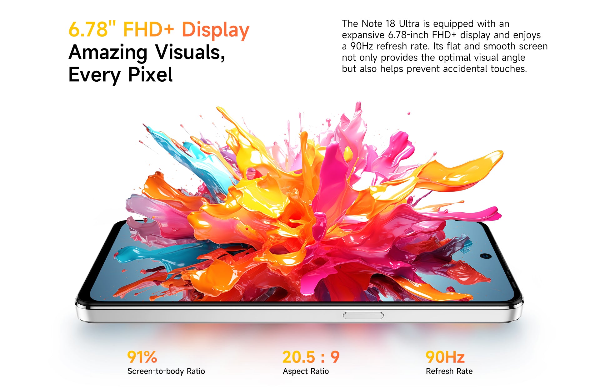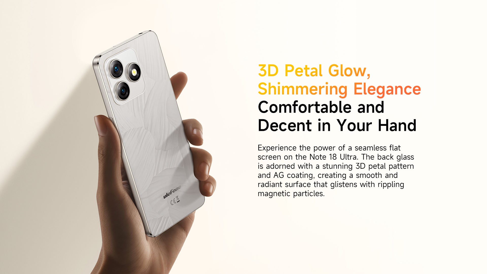 Experience the power of a seamless flat screen on the Note 18 Ultra. The back glass is adorned with a stunning 3D petal pattern and AG coating, creating a smooth and radiant surface that glistens with rippling magnetic particles.